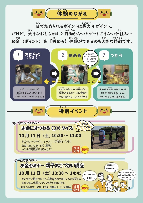 キッズタウン内に、たくさんのお店(ハローワーク、銀行、おもちゃ屋、すし屋、おそうじ屋、新聞社、マッサージ店)がある小さなまちを作りました。そのお店ではたらくと、お給料「しろぼポイント」が貯まります。働いて物を売ることや働いてお金を得ることの楽しさを子ども達に分かりやすいよう工夫しました。働いて得た「しろぼポイント」はキッズタウン内のおもちゃ屋さんで好きなおもちゃとの交換や貯金して後日使うこともできます。 - 消費生活、お金に関する情報提供、J-FLEC(金融経済教育推進機構)の紹介コーナー
