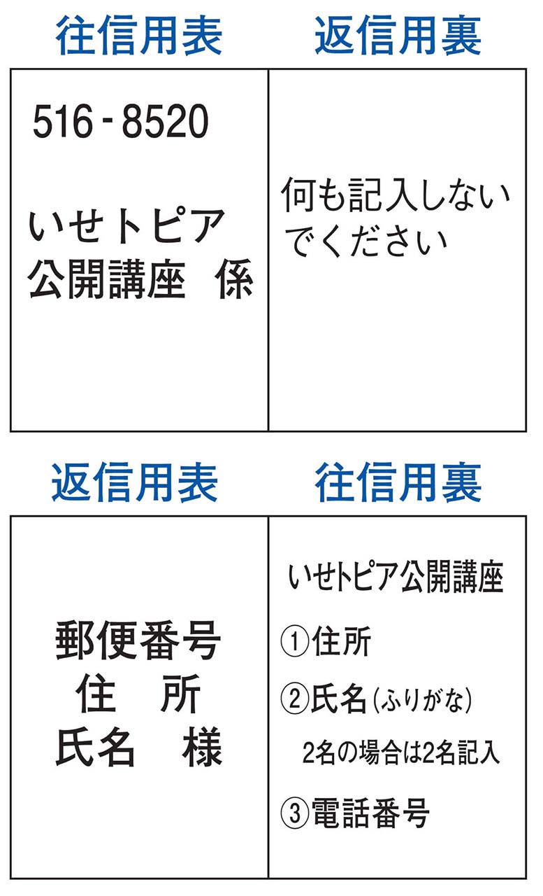 - 1枚の往復はがきで2人(中学生以上)まで申し込みできます。(2人の場合は必ず2人の名前をこ記入ください)返信する住所は1人で結構です。