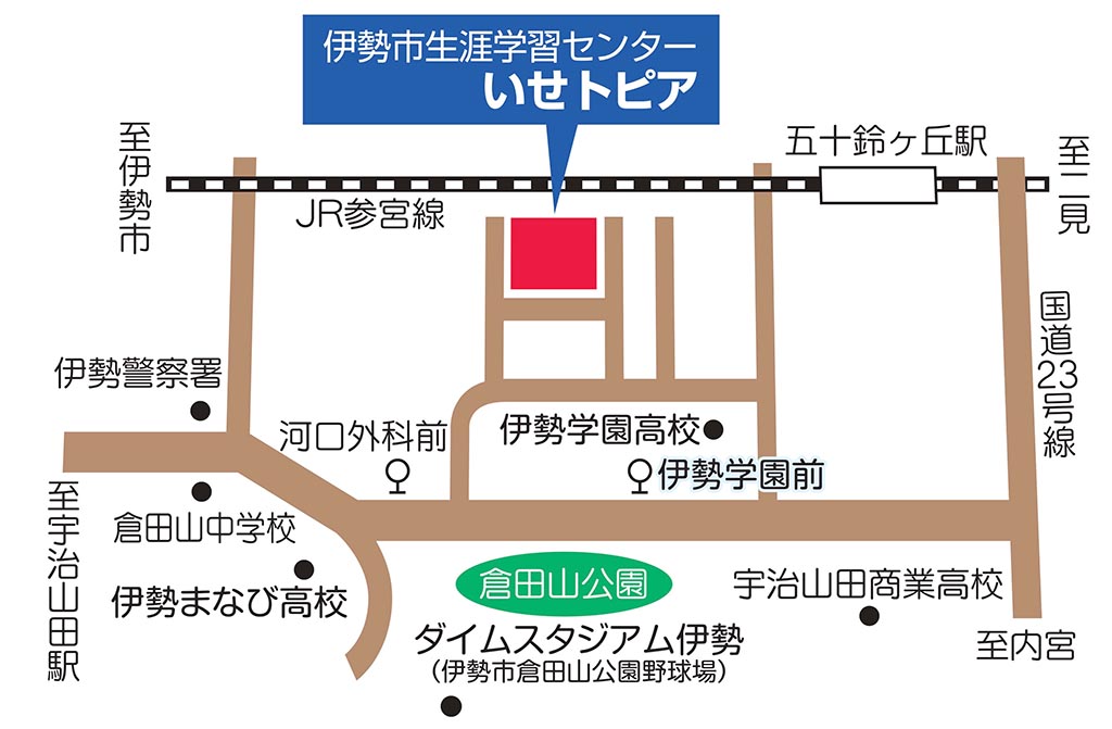 伊勢インターを伊勢市街方面へ降り、 国道23号線より「黒瀬町」の信号より伊勢市街 (伊勢筈察署)方面へ左折してください。 - 公共交通機関でお越しの場合は