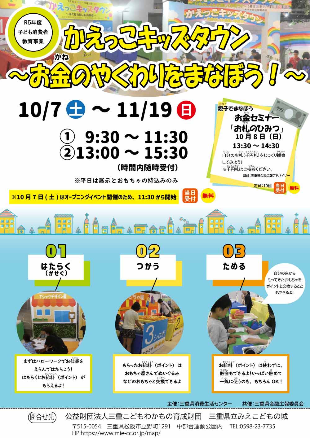子どもたちが「お金の仕組みや流れ」について楽しく学べるイベント、「かえっこキッズタウン~お金のやくわりをまなぼう!~」を、みえこどもの城で開催します。
