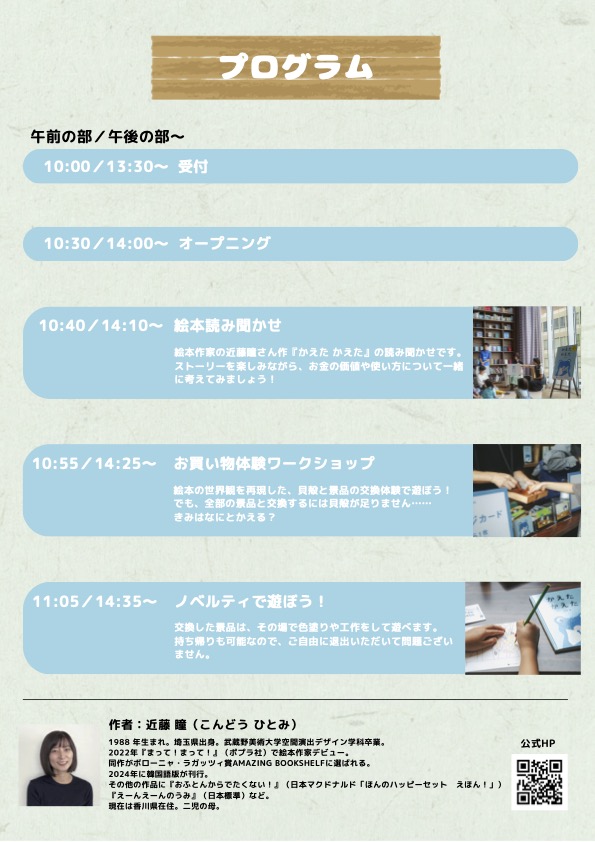 “おかねのかち”を考える絵本『かえたかえた』の読み聞かせや、お買い物を楽しく疑似体験するワークショップもご用意しています。